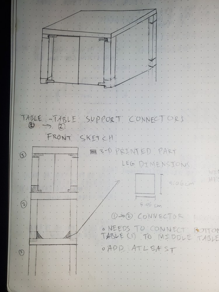 Below are images of three prototype leg-table connectors that I designed using Solidworks CAD. Left-most image is my first attempt and the right-most image is my final design which is currently being 3D printed.