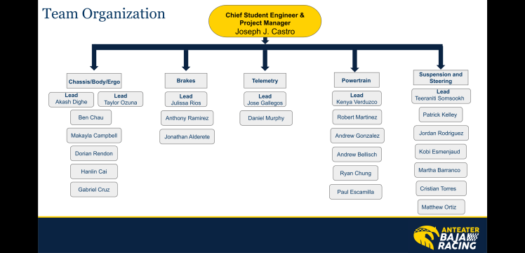 As UCI SAE Baja’s Chief Engineer and Project manager, I oversaw the tasks of five vehicle subsystems, managed our product’s finance and accelerated timeline, and communicated with companies for material and component purchases. In addition, I performed quality control by inspecting every component for potential static and dynamic failure modes to ensure overall vehicle reliability.