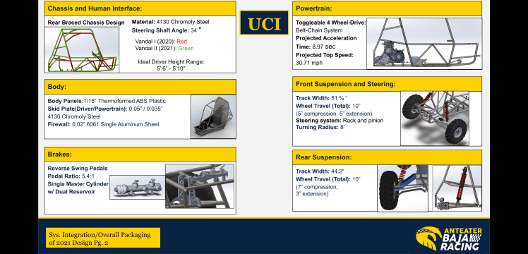 The objective of the UCI SAE Baja team was to develop a reliable, competitive single-seater off road vehicle that met all SAE safety standards.